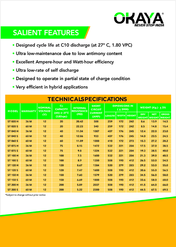 Okaya Solar Tubular Battery -ST 040S 12V/40Ah-480W/40AH